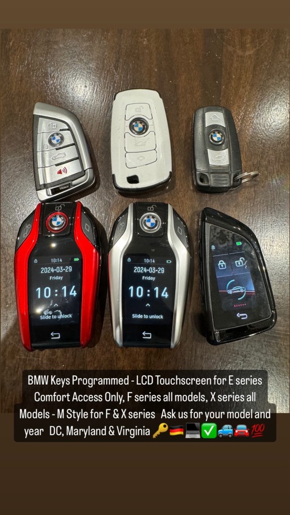 BMW Keys Programmed – LCD Touchscreen for E series Comfort Access Only, F series all models, X series all Models – M Style for F & X series Ask us for your model and year DC, Maryland & Virginia 🔑🇩🇪💻✅🚙🚘💯
