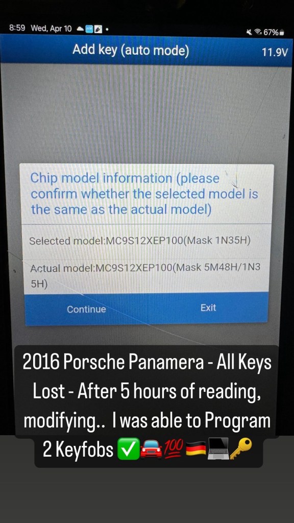 2016 Porsche Panamera – All Keys Lost – After 5 hours of reading, modifying.. I was able to Program 2 Keyfobs ✅🚘💯🇩🇪💻🔑 Cesar Martinez Uncategorized April 17, 2024 1 Minute Share this: Click to share on X (Opens in new window) X Click to share on Facebook (Opens in new window) Facebook Like Loading... Published by Cesar Martinez View all posts by Cesar Martinez Published April 17, 2024