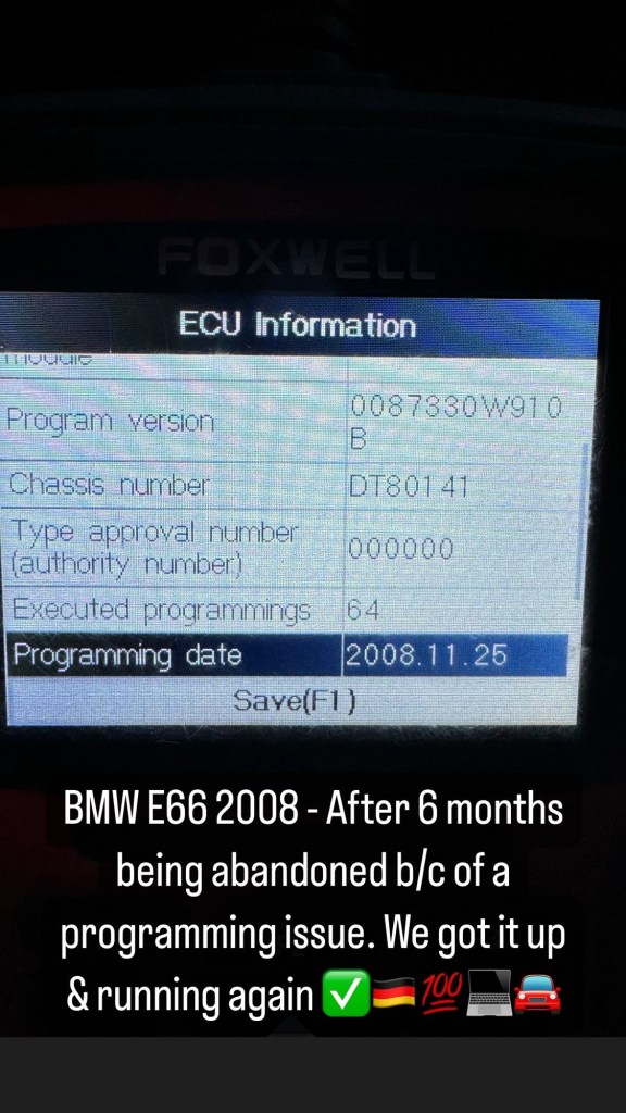 BMW E66 2008 – After 6 months being abandoned b/c of a programming issue. We got it up & running again ✅🇩🇪💯💻🚘 Cesar Martinez Uncategorized May 1, 2024 1 Minute Share this: Click to share on X (Opens in new window) X Click to share on Facebook (Opens in new window) Facebook Like Loading... Published by Cesar Martinez View all posts by Cesar Martinez Published May 1, 2024