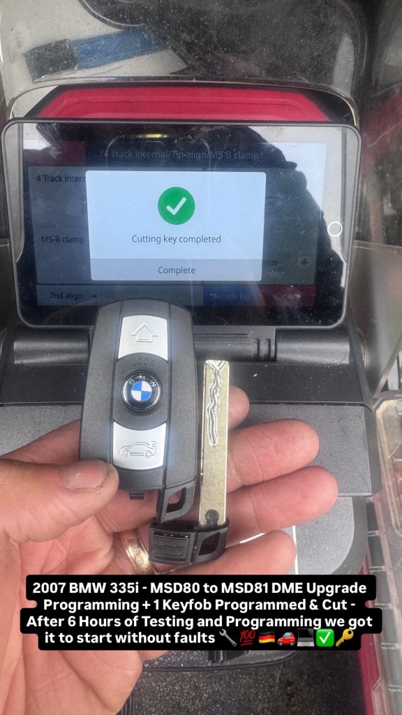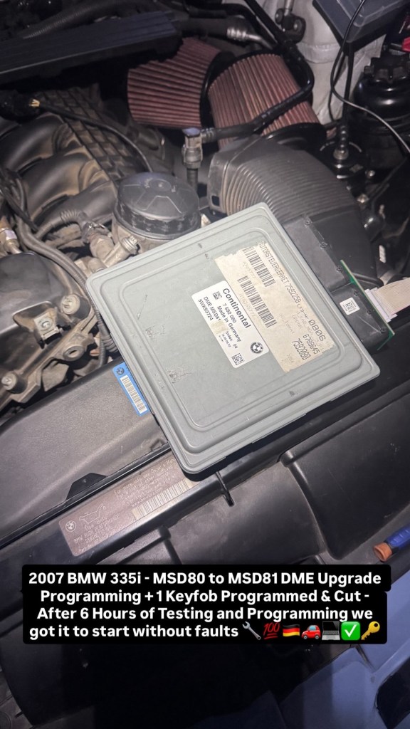 2007 BMW 335i – MSD80 to MSD81 DME Upgrade Programming + 1 Keyfob Programmed & Cut – After 6 Hours of Testing and Programming we got it to start without faults 🔧💯🇩🇪🚗💻✅🔑 Cesar Martinez Uncategorized November 15, 2025 1 Minute Share this: Click to share on X (Opens in new window) X Click to share on Facebook (Opens in new window) Facebook Like Loading... Published by Cesar Martinez View all posts by Cesar Martinez Published November 15, 2025