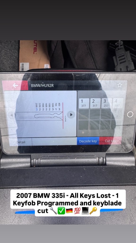 2007 BMW 335i – All Keys Lost – 1 Keyfob Programmed and keyblade cut ๐งโ ๐ฉ๐ช๐ฏ๐ป๐ Cesar Martinez Uncategorized February 18, 2026 1 Minute Share this: Share on X (Opens in new window) X Share on Facebook (Opens in new window) Facebook Like Loading... Published by Cesar Martinez View all posts by Cesar Martinez Published February 18, 2026