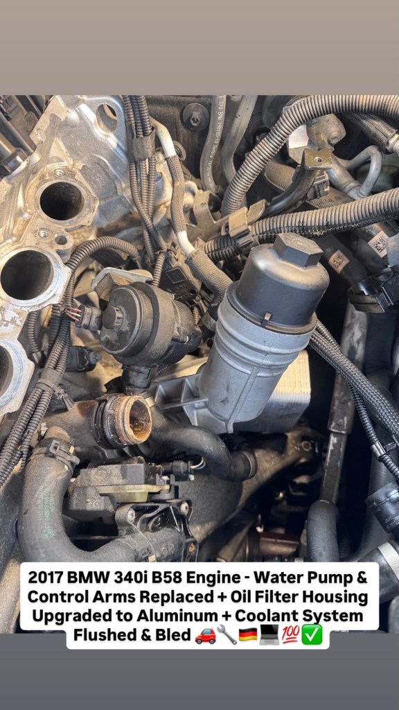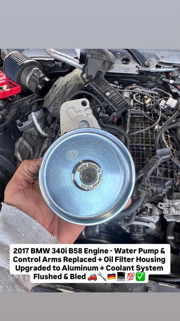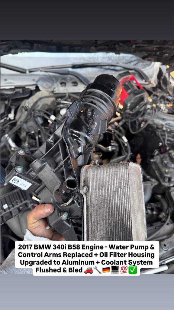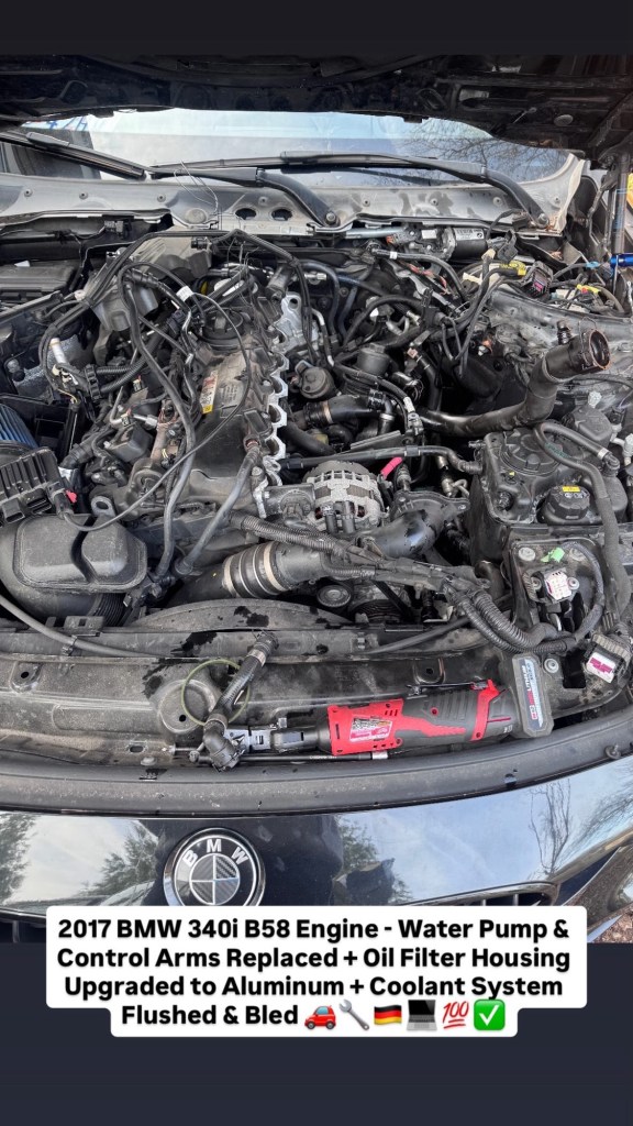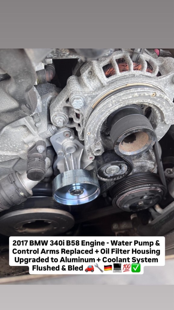 2017 BMW 340i B58 Engine – Water Pump & Control Arms Replaced + Oil Filter Housing Upgraded to Aluminum + Coolant System Flushed & Bled 🚗🔧🇩🇪💻💯✅ Cesar Martinez Uncategorized March 14, 2026 1 Minute Share this: Share on X (Opens in new window) X Share on Facebook (Opens in new window) Facebook Like Loading... Published by Cesar Martinez View all posts by Cesar Martinez Published March 14, 2026
