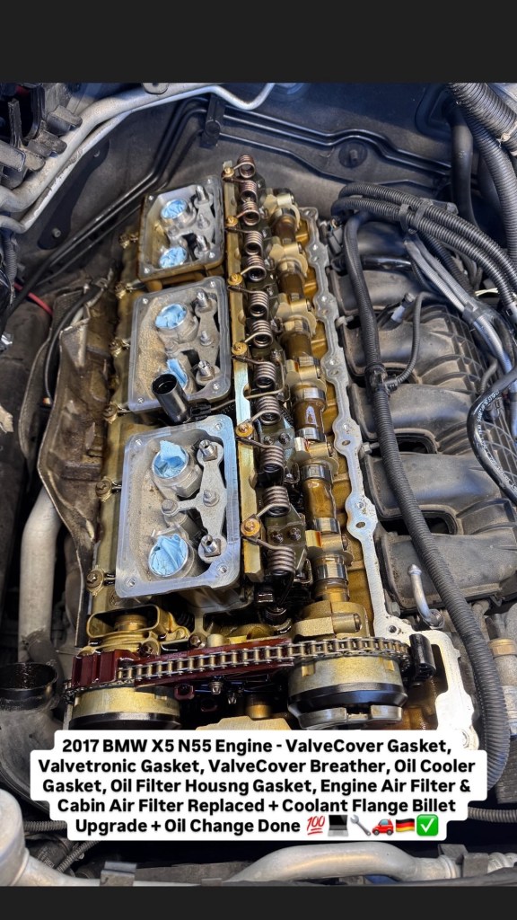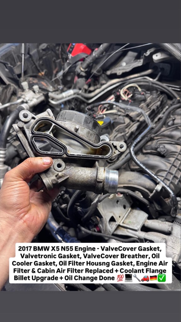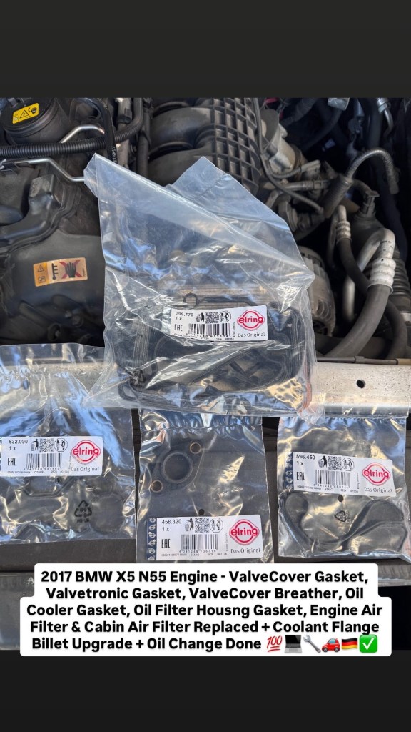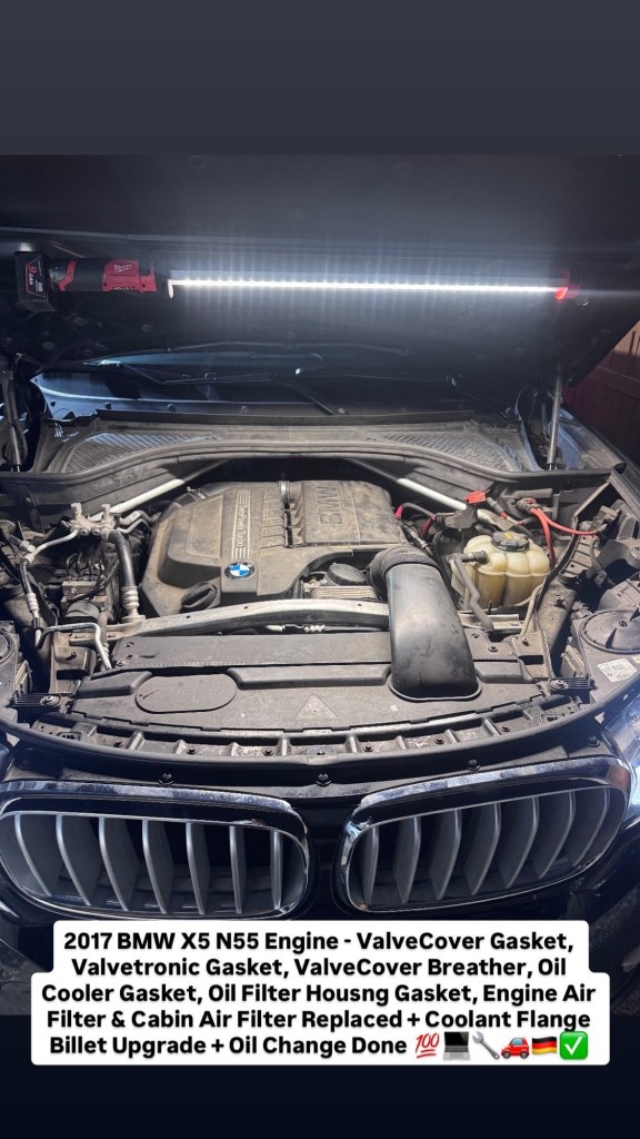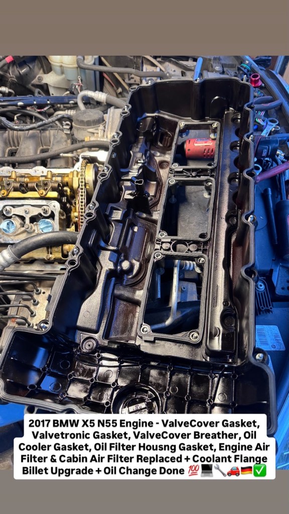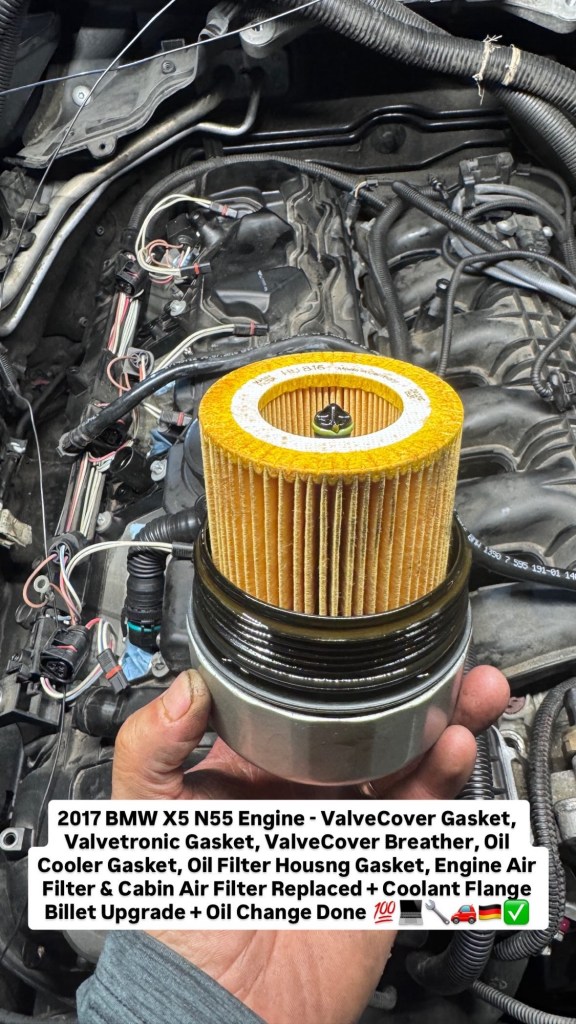 2017 BMW X5 N55 Engine – ValveCover Gasket, Valvetronic Gasket, ValveCover Breather, Oil Cooler Gasket, Oil Filter Housng Gasket, Engine Air Filter & Cabin Air Filter Replaced + Coolant Flange Billet Upgrade + Oil Change Done 💯💻🔧🚗🇩🇪✅ Cesar Martinez Uncategorized March 25, 2026 1 Minute Share this: Share on X (Opens in new window) X Share on Facebook (Opens in new window) Facebook Like Loading... Published by Cesar Martinez View all posts by Cesar Martinez Published March 25, 2026