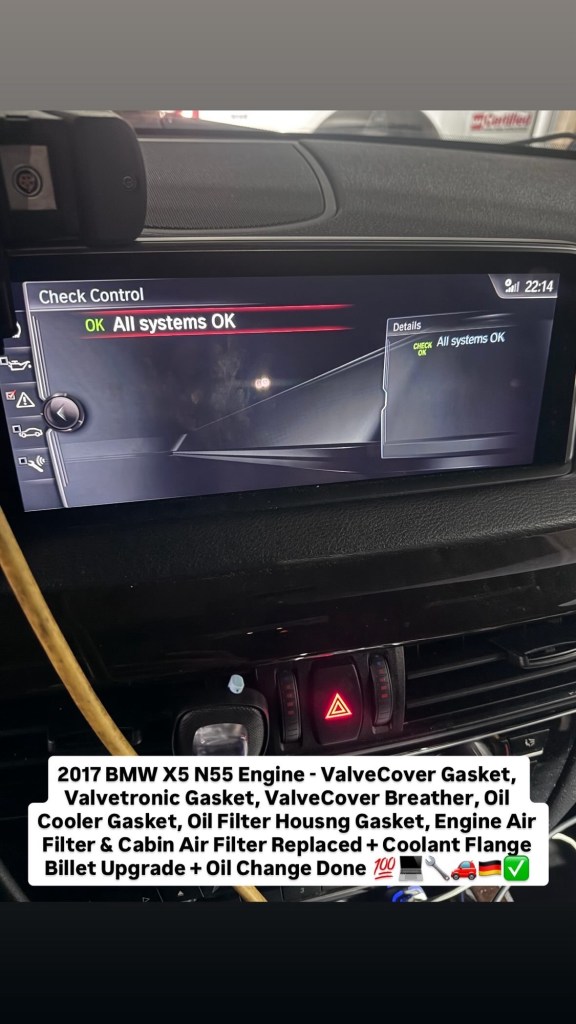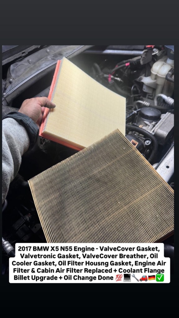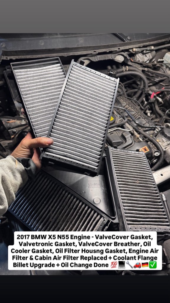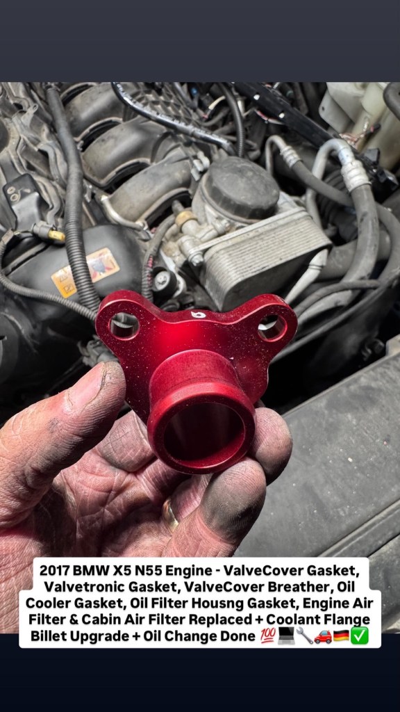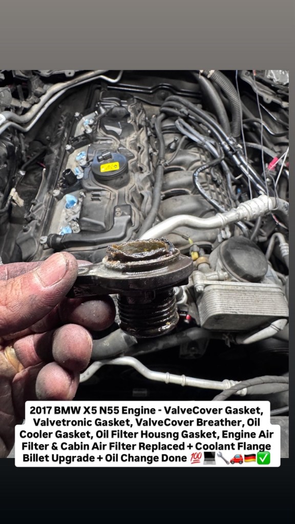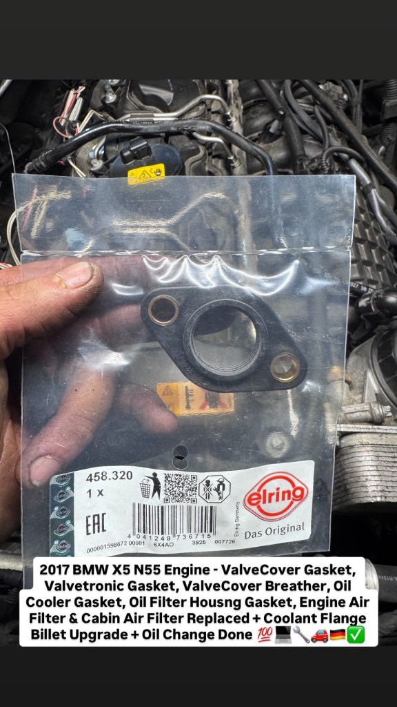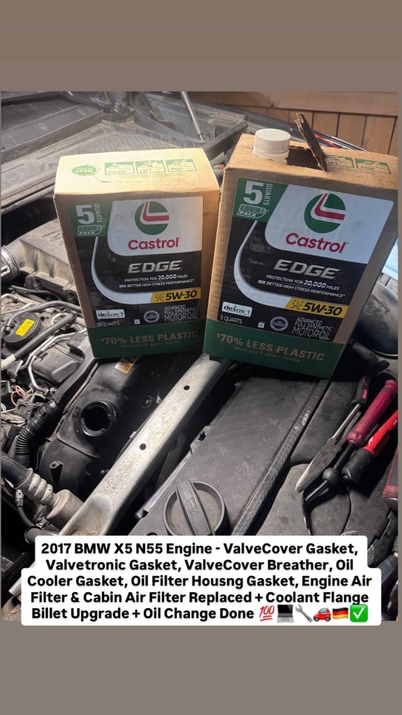 2017 BMW X5 N55 Engine – ValveCover Gasket, Valvetronic Gasket, ValveCover Breather, Oil Cooler Gasket, Oil Filter Housng Gasket, Engine Air Filter & Cabin Air Filter Replaced + Coolant Flange Billet Upgrade + Oil Change Done 💯💻🔧🚗🇩🇪✅ Cesar Martinez Uncategorized March 25, 2026 1 Minute Share this: Share on X (Opens in new window) X Share on Facebook (Opens in new window) Facebook Like Loading... Published by Cesar Martinez View all posts by Cesar Martinez Published March 25, 2026