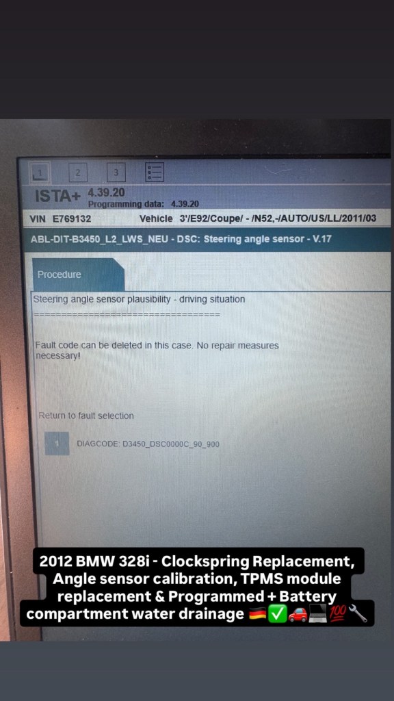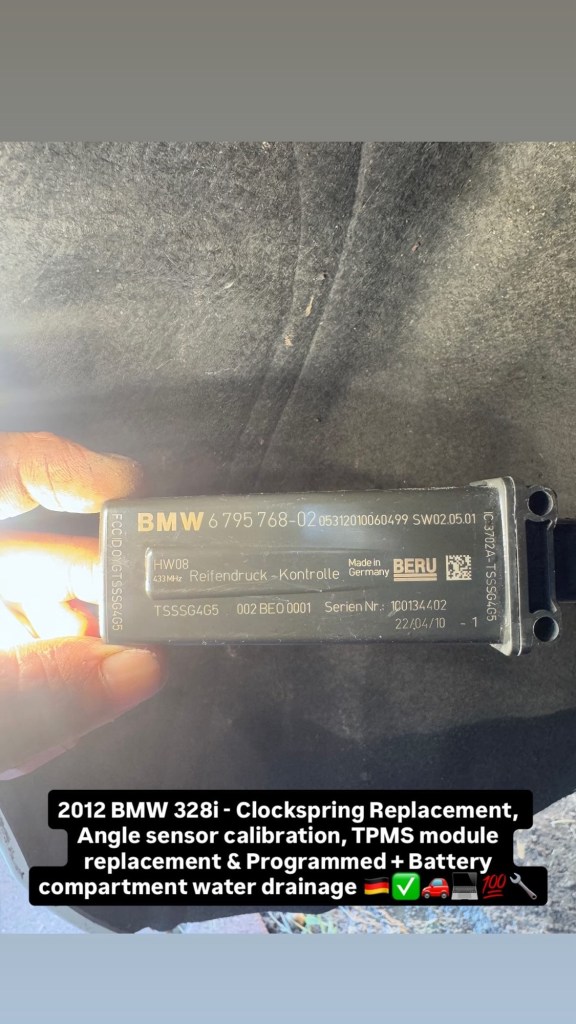 2012 BMW 328i – Clockspring Replacement, Angle sensor calibration, TPMS module replacement & Programmed + Battery compartment water drainage 🇩🇪✅🚗💻💯🔧